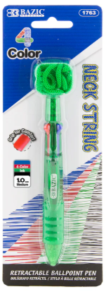 4-COLOR NECK STRING PEN. Each pack includes 1-Retractable 4-Color Ballpoint Pens; Ink Color: Black, Blue, Red and Green. Transparent barrel colors...